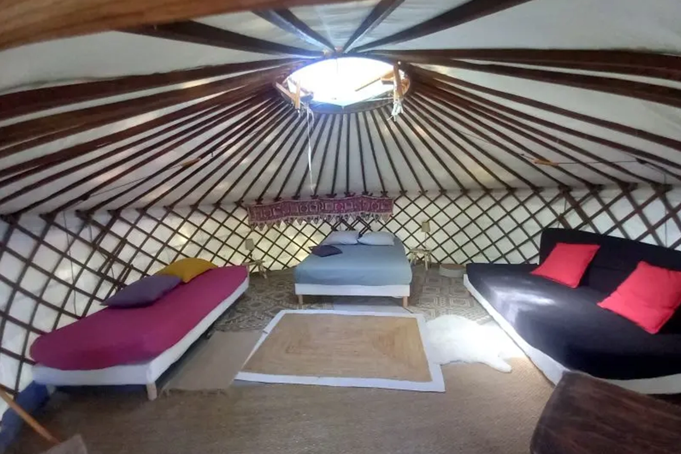 Une grande yourte mongole chaleureuse et lumineuse, parfaite pour l’ambiance paisible, sa lumière tamisée est idéal pour le repos des enfants et des plus grands, un vrai dépaysement pour profiter de la magie de Brocéliande.